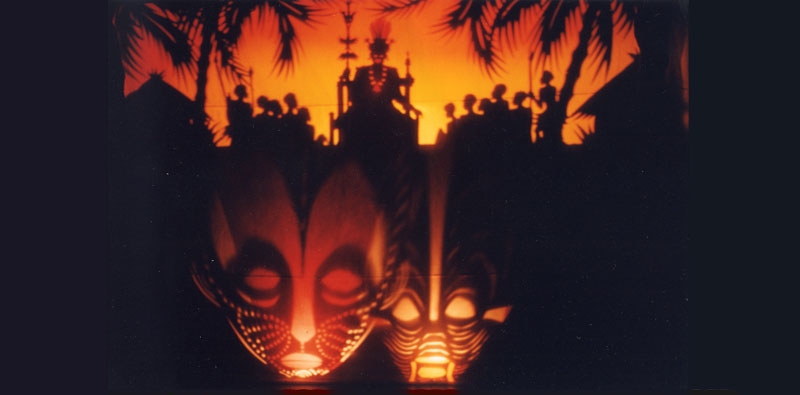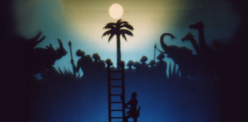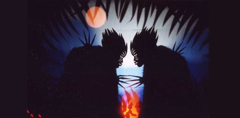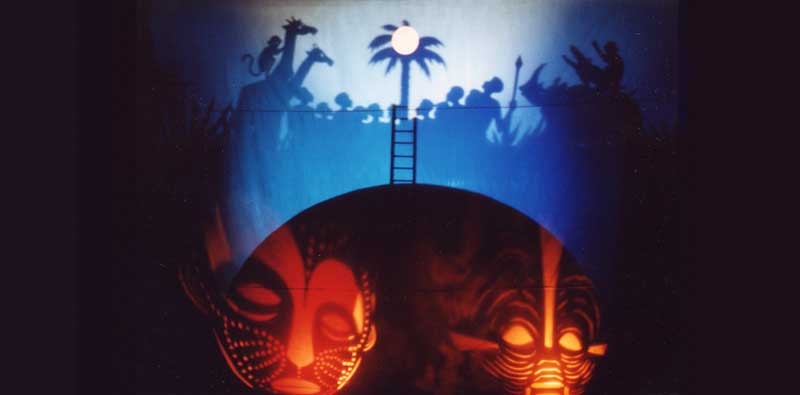 Conte et magie noire Sur scène, une grande toile (4m de large x 2,75m de haut), entourée d’éléments scéniques en volume, inspirés de l’art et de la tradition africaine, sert de support aux ombres. Derrière l’écran, trois comédiens manipulateurs jouent avec leur silhouette corporelle, avec des objets, des marionnettes, projettent des décors et des couleurs. Des silhouettes surgissent et disparaissent, se cherchent et se transforment.En avant-scène, devant les écrans, un comédien-conteur et un musicien africains nous attirent dans la nuit des temps, au coeur de la forêt africaine … Envoûtés par la lumière, ils dansent, chantent, nous font participer à la fête des ombres et de la lumière. En Afrique, la parole a une valeur sacrée; elle « se mange », disent les conteurs bambaras : « Ce que je sais, je vais le faire sortir de mon ventre, pour le précipiter dans le fond des vôtres ».