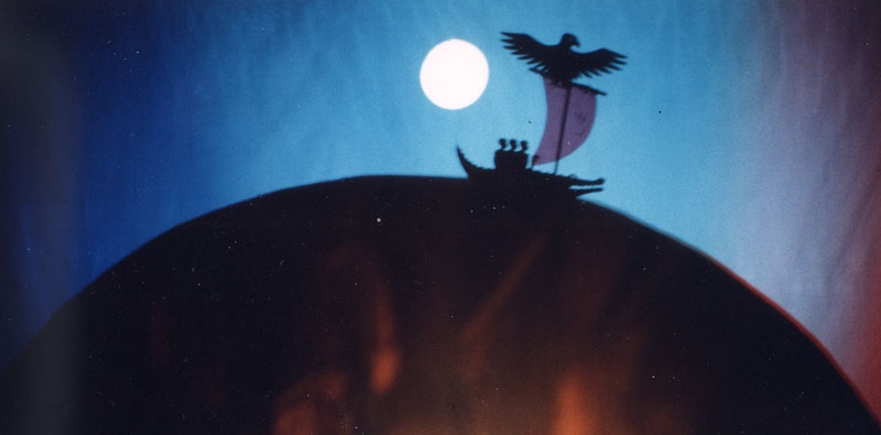La lumière de la lune transforma alors l’ordre des choses. Elle envahit progressivement les écrans, jusqu’à devenir l’espace de la fête. « Jeunes et vieux furent dans la liesse… et les petits lutins se mirent à danser la ronde…». Mais les trois compagnons se font vieux. A leur mort, ils emportent la lune avec eux sous la terre, dans le royaume des ombres. «Cette insolite lumière dérangea les morts et les tira de leur sommeil. Ils s’agitèrent et se relevèrent pour la jouissance et les réjouissances».Lentement les morts ressuscitent et se mettent à jouer au ballon avec la lune… puis ils reprennent leurs habitudes de terriens et retrouvent leurs «divertissements» favoris. L’ambiance de cette scène devient de plus en plus délirante dans le burlesque, la pantomime. «Le tintamarre devint tel, le désordre si grand, le chahut si énorme qu’il alla retentir jusqu’au ciel». Alors les Dieux se mettent en colère et font trembler la terre. Éclairs, tonnerre: foudroyante interférence entre le ciel et le monde souterrain. L’écorce terrestre s’entrouvre et la lune s’échappe de sa prison pour s’envoler vers le cosmos.