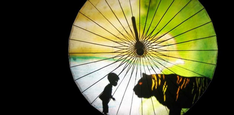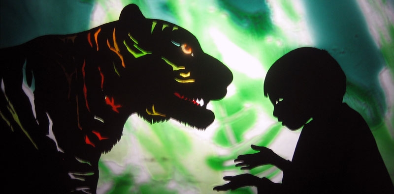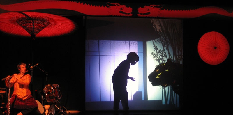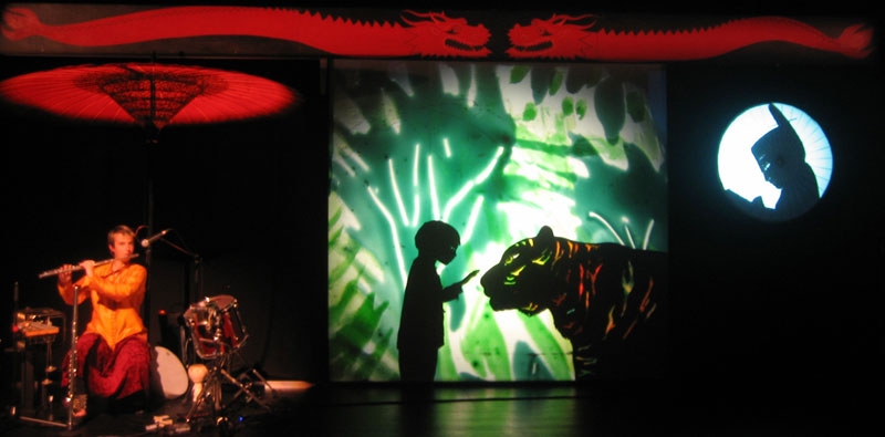 La scénographie Des grandes silhouettes sont jouées en ombre derrière l’écran par des acteurs masqués sous l’apparence d’une Femme-Renard, d’un Devin au double visage, de Wen l’ enfant tranquille… Leurs visages deviennent des formes aux contours très épurés et leurs gestes sont stylisés. Les personnages sont transposés en marionnettes pour les plans éloignés. La tigresse, souvent en très gros plan est une silhouette corporelle: sa taille est surdimensionnée pour contraster avec celle de l’enfant. Elle est représentée parfois par une simple tête à l’énorme mâchoire, une grosse patte, un gros dos… Des lampes mobiles ornées de pochoir permettent de réaliser des figures en lumière et en couleur: par exemple, les yeux du tigre brillant dans la nuit ou sa tête déformée par la colère..